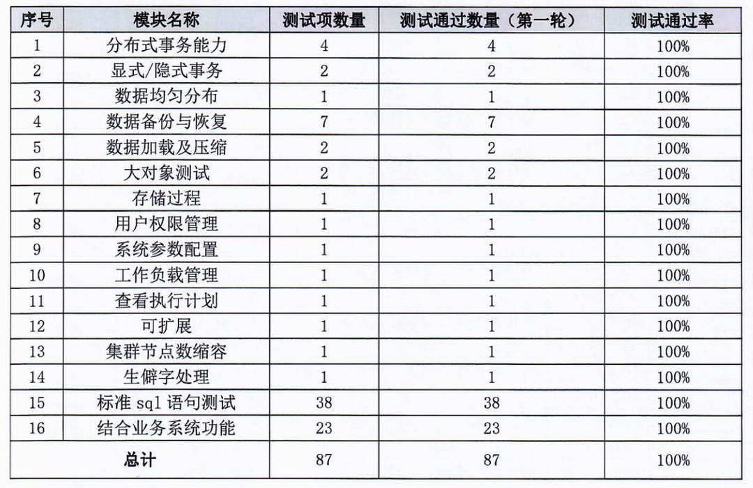 在功能性方面,测试范围包括分布式事务能力、显式/隐式事务、数据均匀分布、数据备份与恢复、数据加载及压缩、大对象测试、存储过程、用户权限管理、系统参数配置、工作负载管理、查看执行计划、可扩展、集群节点数缩容、生僻字处理标准SQL语句测试、结合业务系统功能共16个模块,执行87条用例,测试项100% 全部通过。