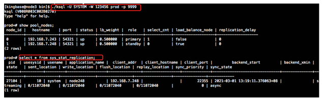 [kingbase@node3 bin]$ ./ksql -U SYSTEM -W 123456 prod -p 9999