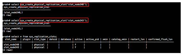 slot_name | plugin | slot_type | datoid | database | active | active_pid | xmin | catalog_xmin | restart_lsn | confirmed_flush_lsn