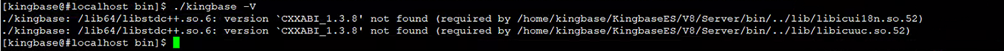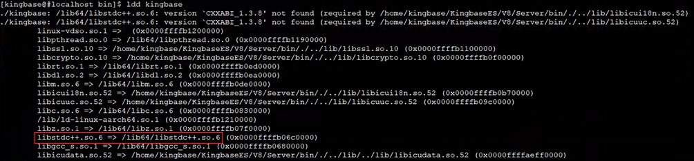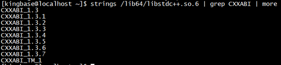 验证操作系统 libstdc++.so.6 文件,确认确实不包含kingbase程序所需要的 CXXABI_1.3.8 版本。