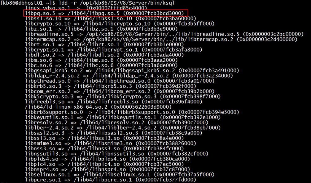 果然,ksql 使用了/lib64 下的libpq文件,而这个文件是操作系统安装时带入的PostgreSQL文件。修改LD_LIBRARY_PATH环境变量,指向/opt/kb86/ES/V8/Server/lib 目录。