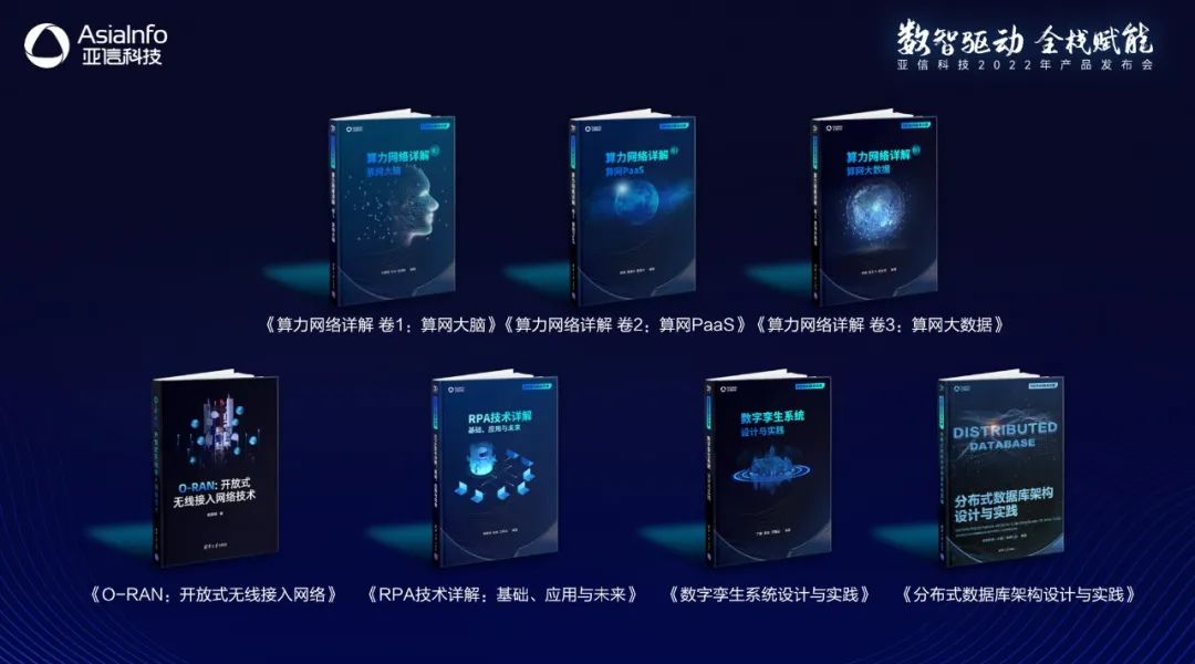 同时,亚信科技携手清华大学出版社即将出版发行的算力网络丛书,O-RAN、RPA、数字孪生、数据库书籍,共7本全新技术专著也在发布会上预发布。