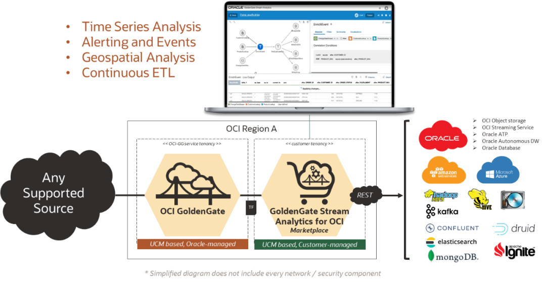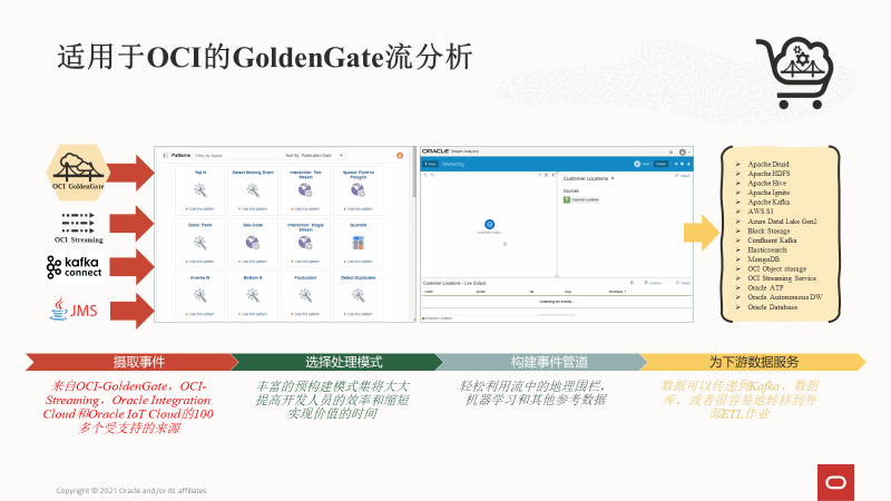 现如今很多场景下,数据都是以持续不断的流事件创建,例如网站的交互、服务器日志、传感器信息等。这种架构往往涵盖了多种不同的数据存储,例如关系型数据库、nosql 数据库、分布式文件系统等。传统的ETL方案虽然能够将这些数据汇聚在一起进行分析,但它却增加了相应的延迟。所以,如果这种分散的、多模型、多云生态系的数据能够在事件发生的同时,也能够持续地对其进行转换和加载,并进行实时分析,这将能够更快地驱动数据产品及价值的迭代。GoldenGate流分析就是Oracle在该领域的重点技术,它可用于可视化地构建数据管道,以对在小于1毫秒的实时窗口中移动的任何数据执行持续ETL或高级分析。有了这个工具,您可以使用GoldenGate轻松地从所有数据库接收数据事件,您也可以使用源连接器从几十个开源Kafka Connect适配器接收数据事件,任何JMS、MQ或AQ技术也可以将事件发送到流分析管道。此工具使开发人员可以轻松地创建数据管道,并将数据传递回数据存储、对象存储或外部消息传递系统(如Kafka等)。与众不同的是,OCI GoldenGate的动态数据结构能力,在满足企业实时、事件驱动和流数据用例的同时,它提供的还是包括“数据治理”和ACID级数据一致性事务保证的“可信数据”。