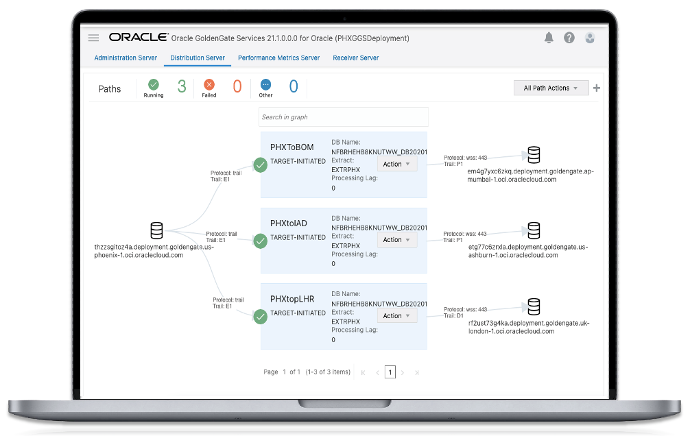 在此过程中,只需点击几下,就可以创建一个弹性GoldenGate数据网格,为您的实时数据集成提供基础,实现与第三方云、SaaS、OCI等不同端点之间的实时数据复制。下面是位于不同OCI区域的两个不同Oracle自治数据库之间的实时数据库复制的示例: