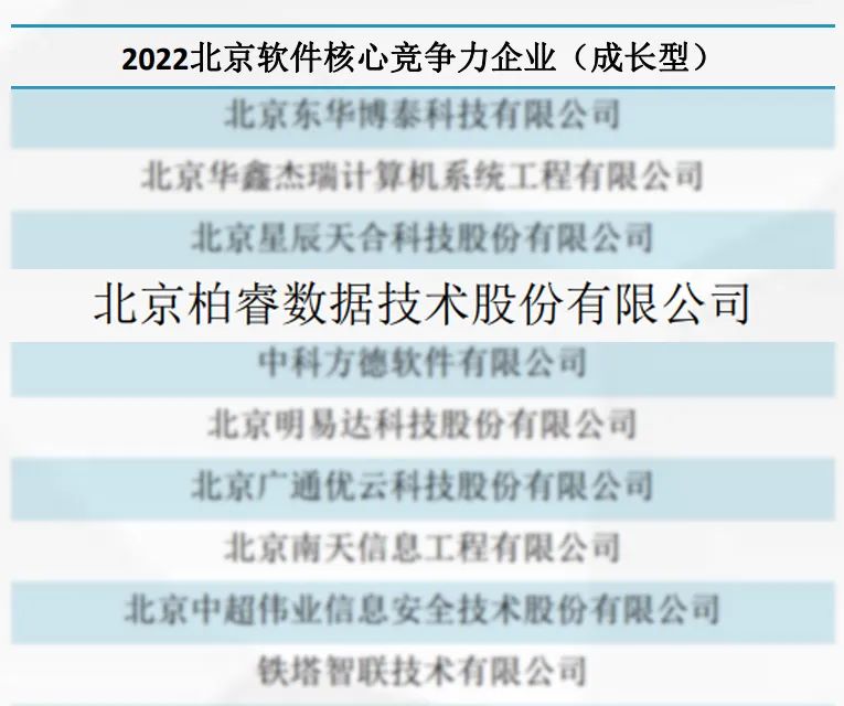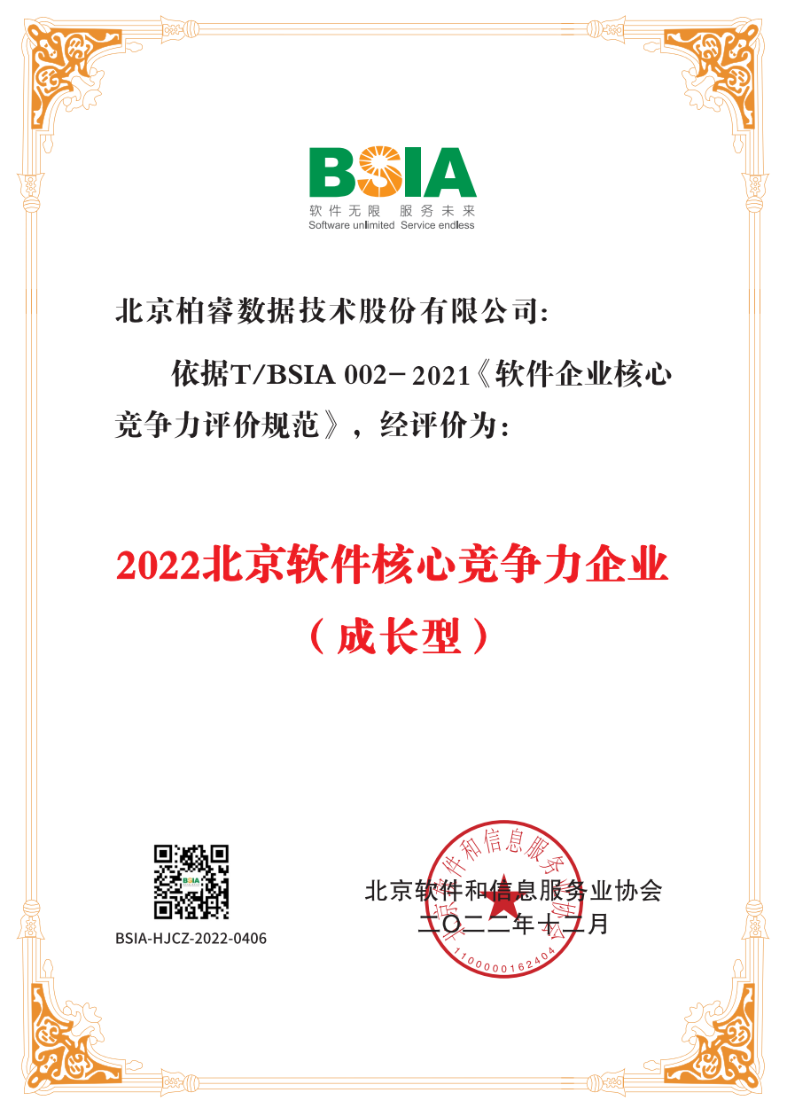 柏睿数据在2020和2021年度连续两年蝉联该报告“北京软件核心竞争力企业(创新型)”后,今年首次获评“北京软件核心竞争力企业(成长型)”,完成了从创新型企业到成长型企业的升级转变,这是对过去三年逆势爆发性成长的充分肯定,同时也说明公司已经稳步完成核心技术突破、产品应用创新和行业标杆树立的阶段性发展目标,正式迈入了行业发展的高速增长阶段。