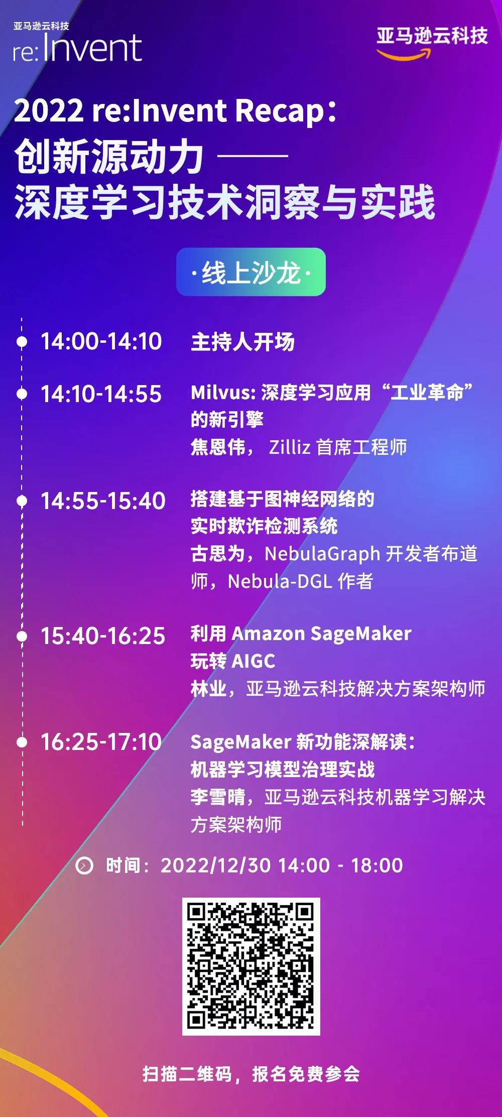 作为领先的开发者技术问答社区, 在本次沙龙上,SegmentFault 思否为大家邀请到了亚马逊云科技和 Zilliz 、NebulaGraph 等新锐企业的技术专家,与大家一同探讨以下话题,分享他们对深度学习技术洞察与领先实践。