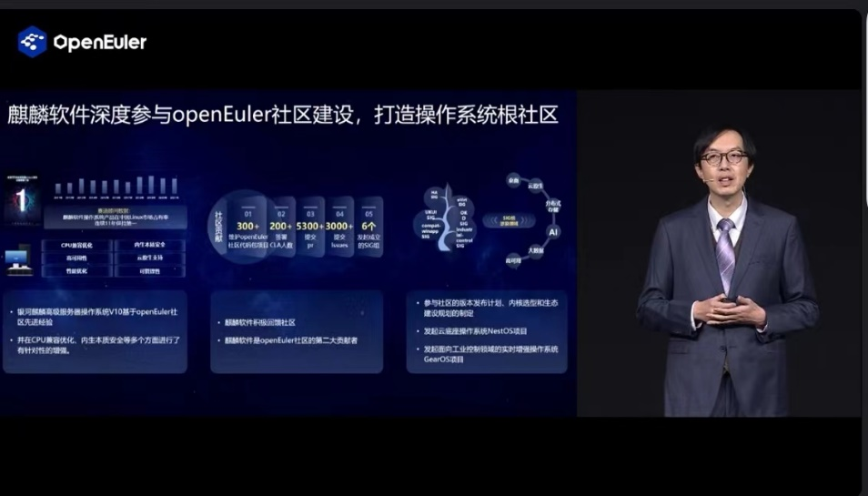 此次峰会上,2023-2024年openEuler委员会常务委员会正式亮相。麒麟软件高级副总经理韩乃平作为openEuler委员会副主席参与并见证。随后,韩乃平出席“欧拉之星”颁奖典礼并致辞。他表示,openEuler社区的发展离不开每位社区成员的辛勤付出,用户成功是社区发展的动力,软件成功是社区发展的基石,并对openEuler全体成员表达感谢。