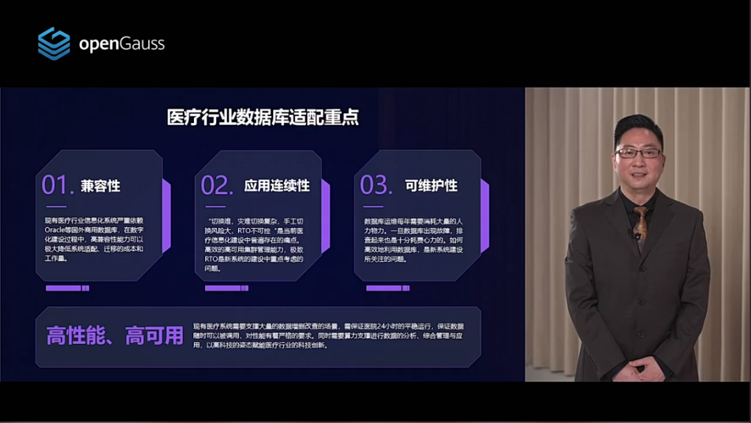 南京市卫生信息中心副主任陈平发表了《openGauss在医疗卫生行业的创新实践》主题演讲,分享了南京市远程影像中心数据库替换的项目实施经验,以及选择openGauss技术路线、海量数据库选型等方面的考量。