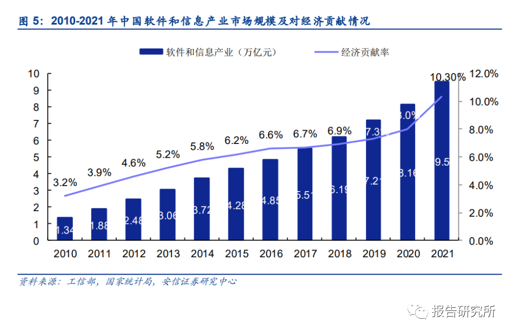 软件和信息技术作为现代科技的重要组成,对科技自立自强至关重要。从软件和信息产业的 整体规模来看,从2010年的1.34万亿提高到2020年的8.16万亿,年复合增长率高达20%, 说明市场一直保持高速增长。从软件和信息产业对经济的贡献来看,贡献率从2010年的3.2% 提高到 2020 年 8%,可见软件和信息产业已经成为推动经济发展的重要力量。