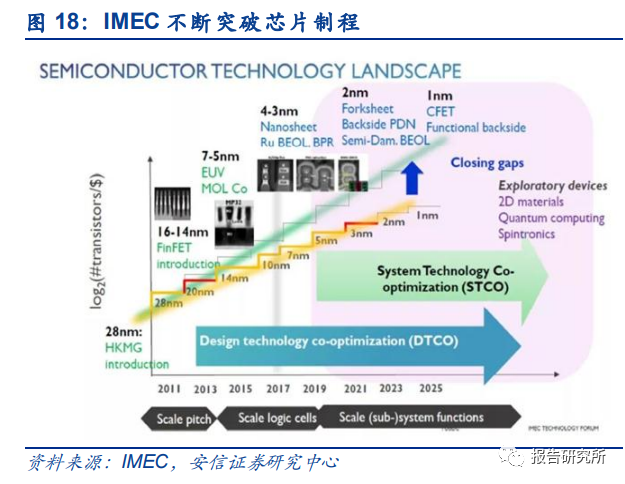 从信息技术领域的四大经典定律看信创产业在技术原理层面的四大痛点和新的机遇:1)摩尔定律驱动新技术指数级进步。摩尔定律是指集成电路上可以容纳的晶体管数目在大 约每经过 18 个月到 24 个月便会增加一倍,性能也将提升一倍。换言之,处理器的性能大约 每两年翻一倍,同时价格下降为之前的一半,即反摩尔定律。反摩尔定律倒逼所有硬件设备 公司都必须跟上摩尔定律规定的更新速度,促使整个科技领域发展进步。摩尔定律正在逐渐失效,行业正在进入后摩尔定律时代。从现实角度出发,芯片行业如果一 直按照摩尔定律所描述演进,那么强者恒强,中国只能一直跟在后面疲于追赶。而摩尔定律 的逐渐失效给中国一个迎头赶上的重要战略窗口期。