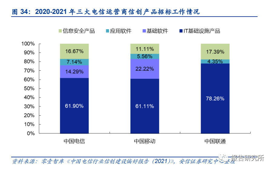 除大规模硬件采购外,2021 年以来运营商纷纷开启了电信领域国产化全面布局,建立“信 创实验室”,启动软件迁移适配工作。运营商以“信创实验室”为载体,不断提升技术支撑 保障能力,推进办公系统在国产技术环境中的迁移适配,积极开展一般业务系统乃至部分关 键业务系统的测试。2020 年初,中国联通信息技术应用创新联合实验室率先建立,并已在 广东、浙江、青海、湖南、贵州、吉林、黑龙江等 7 省建立信创攻关分基地。目前,实验室 形成了“全国资源共享、一点适配为用户提供典型场景适配服务”的对外服务模式,具备基 于“PK”“鲲鹏”“龙芯”“海光”等主流核心技术架构的适配平台和典型应用适配场景能力。