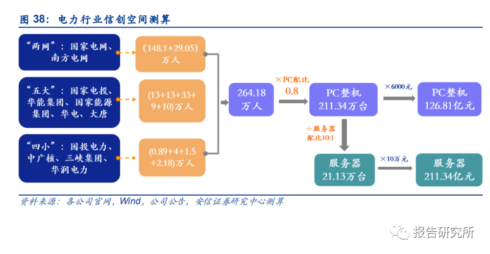 我国电力行业的市场主体主要有“两网五大四小”。国家电网和南方电网承担着全国的电网 运营,其中国家电网负责 27 个省市,南方电网负责广东、广西、云南、海南、贵州五省的 电网运营。在发电市场中,以“五大四小”为代表的电力央企始终占据核心位臵。假设 PC 与从业人员的数量比例为 0.8,我们测算出电力行业 PC 整机(含软硬件)的需求量约 211 万台,市场空间约 127 亿元;假设 PC 对应服务器的配比为 10:1,服务器的需求量约 21.13 万台,服务器的市场空间约 211.34 亿元。