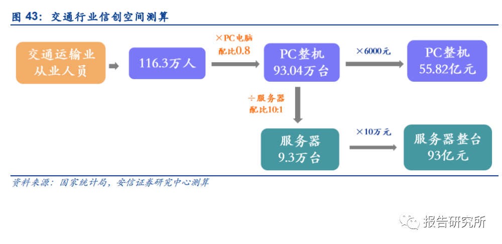 根据《2021 中国统计年鉴》数据,截至 2020 年末,交通运输、仓储和邮政业的从业人员为 116.3 万人(包括国有单位和城镇集体单位)。我们测算交通运输行业 PC 整机(含软硬件) 的需求量约 93 万台,市场空间约 56 亿元;服务器的需求量约 9.3 万台,服务器总的市场空 间约 93 亿元。