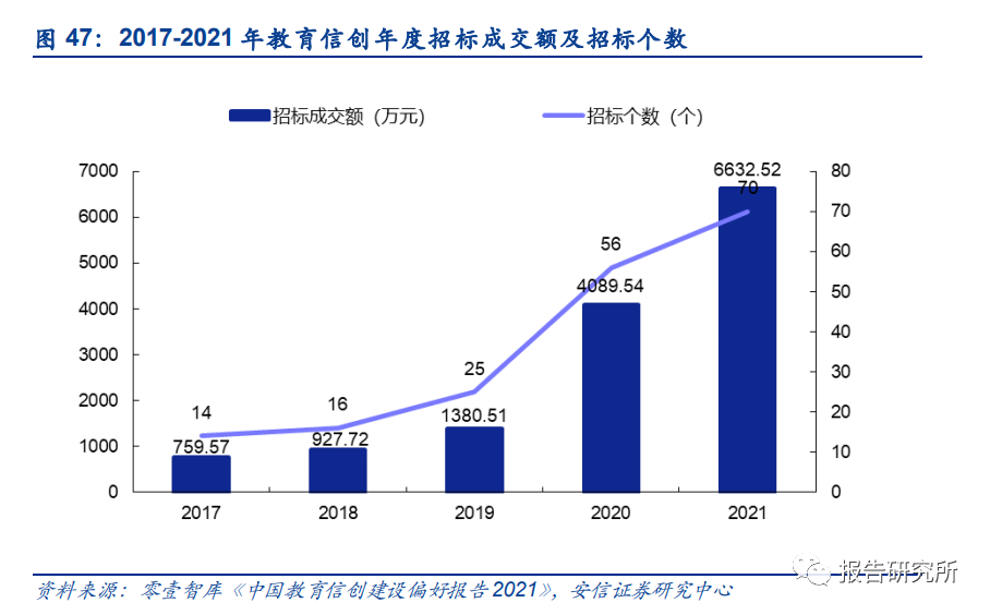 在教育信息化 2.0 热潮下,信创产业为教育装备市场的创新突破开启了新局面。从各地区招 标数据来看,教育信创产品招标数量逐年增多,成交金额呈现出上涨态势。根据零壹智库《中 国教育信创建设偏好报告 2021》,自 2019 年正式提出发展信创产业以来,全国各地教育类 信创招标项目成交金额大幅增长,2019 年突破一千万元,2021 年突破五千万元。