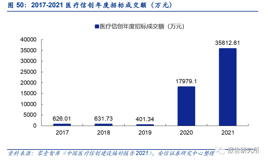 从医疗信创成交产品及其品牌来看,目前医疗行业的国产化替代主要集中在数据库、服务器、 打印机、防火墙等数据安全类产品。其中数据库主要选择品牌为金蝶和超聚变,如佛山市南 海区第六人民医院在更换 HIS 系统时选择了金蝶 HIS 数据库;服务器和交换机类产品各医院 偏好的品牌主要是华为、新华三和浪潮;在显示设备中,四川长虹成为医院的首选品牌。除此之外,天融信防火墙、深信服桌面云、东软汉枫系统数据采集设备、深圳迈瑞呼吸机也在 医院的招标采购之列。近两年来,医疗行业的信创项目成交金额大幅增长,根据零壹智库《中 国医疗信创建设偏好报告 2021》,2020 年以来信创工作在全国范围内全面铺展,医疗领域 成交金额从 2019 年的 401.34 万元增加到 2021 年的 3.58 亿元,实现了医疗领域国产化替 代工作的跨越式发展。