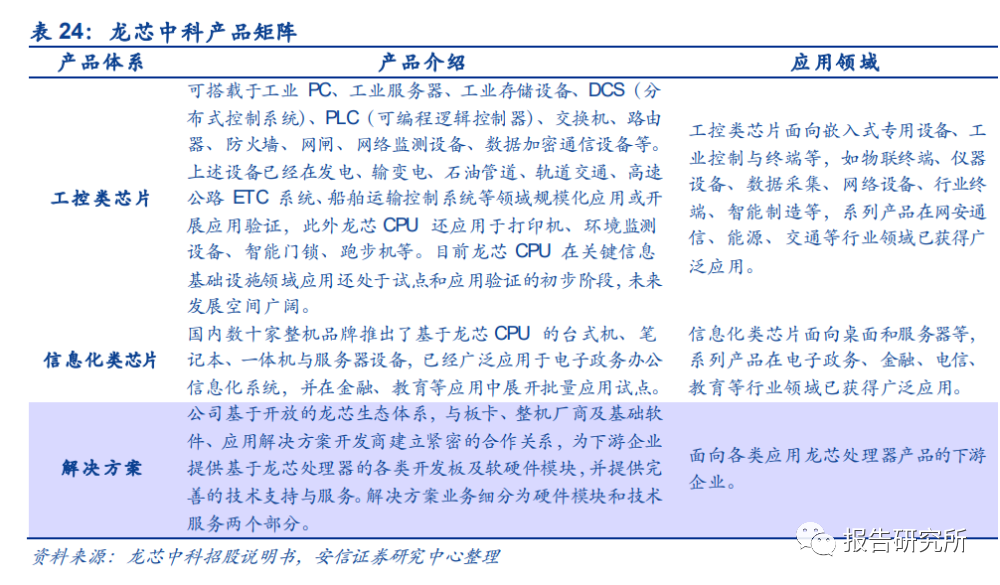 龙芯中科主营业务为处理器及配套芯片的研制、销售及服务,主要产品与服务包括龙芯 1 号 系列、龙芯 2 号系列、龙芯 3 号系列处理器及配套芯片产品与基础软硬件解决方案业务。目前,龙芯中科基于信息系统和工控系统两条主线开展产业生态建设,面向网络安全、办公 与业务信息化、工控及物联网等领域与合作伙伴保持全面的市场合作,系列产品在电子政务、 能源、交通、金融、电信、教育等行业领域已获得广泛应用。