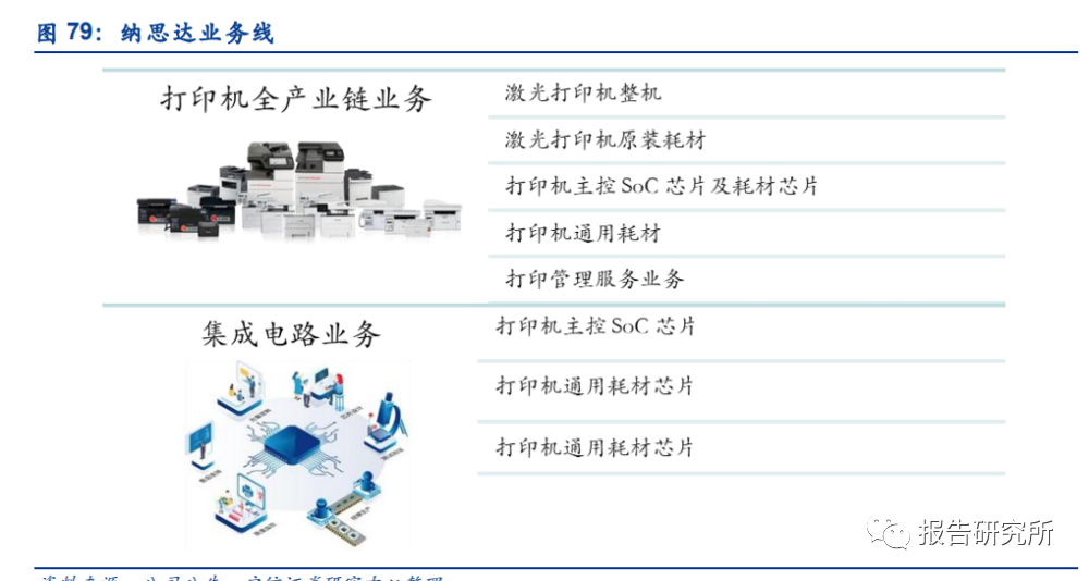 纳思达主营业务包括打印机全产业链业务、集成电路业务,主营产品为激光打印机、复印机、 集成电路芯片、通用打印耗材及耗材核心部件产品,覆盖从上游耗材部件到整机服务的打印 机全产业链解决方案。是一家集研发、设计、生产、销售打印机、耗材及文印输出解决方案 为一体的企业,已全面构建从耗材、集成电路到打印机整机生产的全产业链布局,完成了从 A4 到 A3、黑白到彩色、单功能到多功能、硬件到方案全幅面、全产品线覆盖,为高端用户 提供定制化服务。