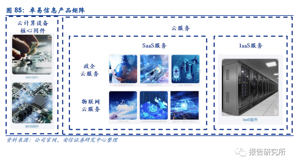 云计算设备核心固件:为 CPU、计算设备厂商等客户,提供服务器、PC、笔记本电脑等计 算设备核心固件的开发及固件产品销售。掌握 X86、ARM、MIPS 等多架构 BIOS 和 BMC 技术,是国产芯片(龙芯、鲲鹏、兆芯等)的 BIOS 供应商。主要客户为 CPU 厂商、计算 设备厂商,如英特尔、联想、华为、浪潮、长城等。云平台技术:以自主研发的卓易云平台为基础,聚焦于政企云和物联网云服务,具有较高的 科技创新属性。主要客户为政企客户,如信创协会、江苏省工信厅、江苏省委编办、南京市 江北新区、宜兴市所有行业部门和乡镇园区等,为政企客户提供 SaaS 层定制化软件服务与 IaaS 层的配套计算资源租赁、运维等服务。