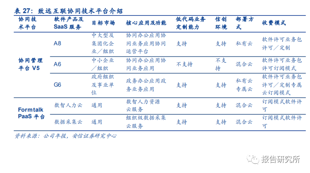 协同管理软件“平台化和生态化”的发展战略,拥有自主研发的协同技术平台 V5,支持混 合云部署、可广泛多端连接与服务云化,且通过其低代码搭建能力,为客户实现业务定制化 与应用整合功能,深耕企业及政务两大市场客户。“云转型”战略,投入研发了协同云平台 V8,采用云原生、微服务架构等主流技术栈,满 足超大/大型集团组织的数字化转型需求,支持超大/大型组织的专属云部署和支持中小组织 的 SaaS 在线订阅的商业模式。