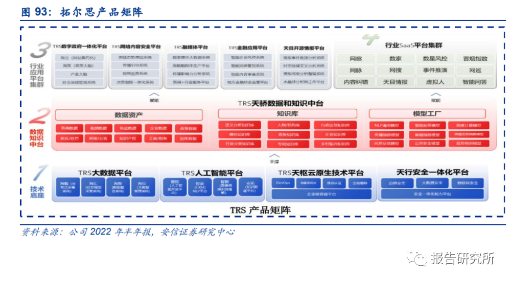 拓尔思国内人工智能和大数据技术及数据服务提供商,前身是 1993 年成立于中关村的北京 易宝北信信息技术有限公司,2011 年于深交所创业板上市。在人工智能领域的优势核心技术 方向是语义智能——基于语义理解的认知智能,是被称为人工智能皇冠上的明珠的“硬科技”。公司以“语义智能+”为发展战略,面向三大重点板块:内容安全和互联网空间治理、数字 政府和数据智能。拓尔思在全国范围拥有 30 多家分支机构,在广州、上海、成都、深圳等城 市均设有分、子公司及办事处,已经发展成为拥有北京、上海、广州和成都四大区域中心,覆 盖全国的市场销售和服务能力,支持全产业链赋能的生态型集团企业。