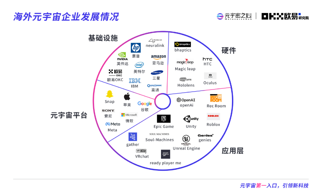 应用层是用户能够感知的重要部分,包括数字医疗、智能工业、教育培训、数字办公等等,打破物理世界和虚拟世界的壁垒,让元宇宙照进现实。◉ 海外元宇宙巨头发展情况