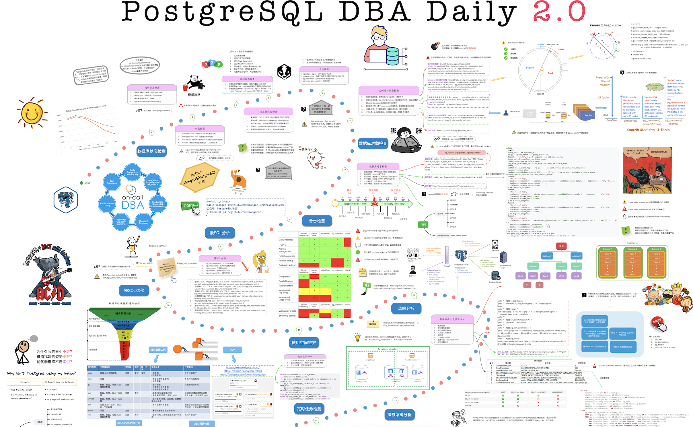 得益于目前的工作环境,今年也输出了大量的实战案例,这些都是实打实的踩坑经验。我有个习惯,就是碰到一个经典案例就做一个整理,哪怕整理的时间再晚,也会坚持尽量不超过一两天就整理出来,毕竟好记性不如烂笔头,记录下来不仅可以帮助自己回顾思考过程中的盲点,还可以加深印象,发散思维,何乐不为之。另外今年也做了几件有意义的事情,首先是PostgreSQL DBA Daily大图的绘制,一张图道尽DBA打怪升级之路,从构思到绘制,前后花了接近一个月,最终的反响也是喜人的,好评连连,当然PostgreSQL DBA Daily 2.0也已经绘制好了,在1.0的基础上添加了大量实战案例链接以及一些新的思考,同时做了大量的美化,原本打算在PostgreSQL大会上与各位见面的,由于疫情原因推迟了,让我们拭目以待!