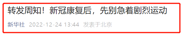 但是切记即使阴了之后也一定要休息好,避免剧烈运动,最新新华社突然发了通知,让大家一定要安心静养,先别急着剧烈运动👇🏻 之所以要突然发这样的通知,是因为最近连续出现了很多起悲剧,转阴后有相当多的人有持续不断的疲惫感,这股疲惫感就是身体还在不断对抗病毒的表现。