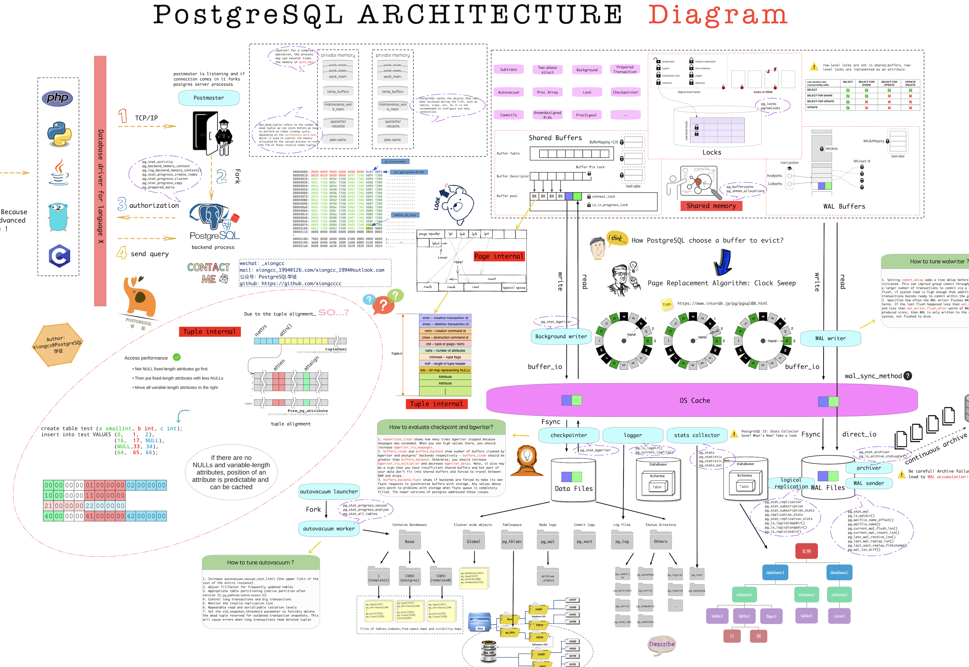 其次是PostgreSQL Architecture大图,已经和各位见面了,一张图展现PostgreSQL的体系架构,反响也很不错,已经捐给了社区,后续可能会在官方weekly里面看到,各位可以后台回复关键字获取链接。