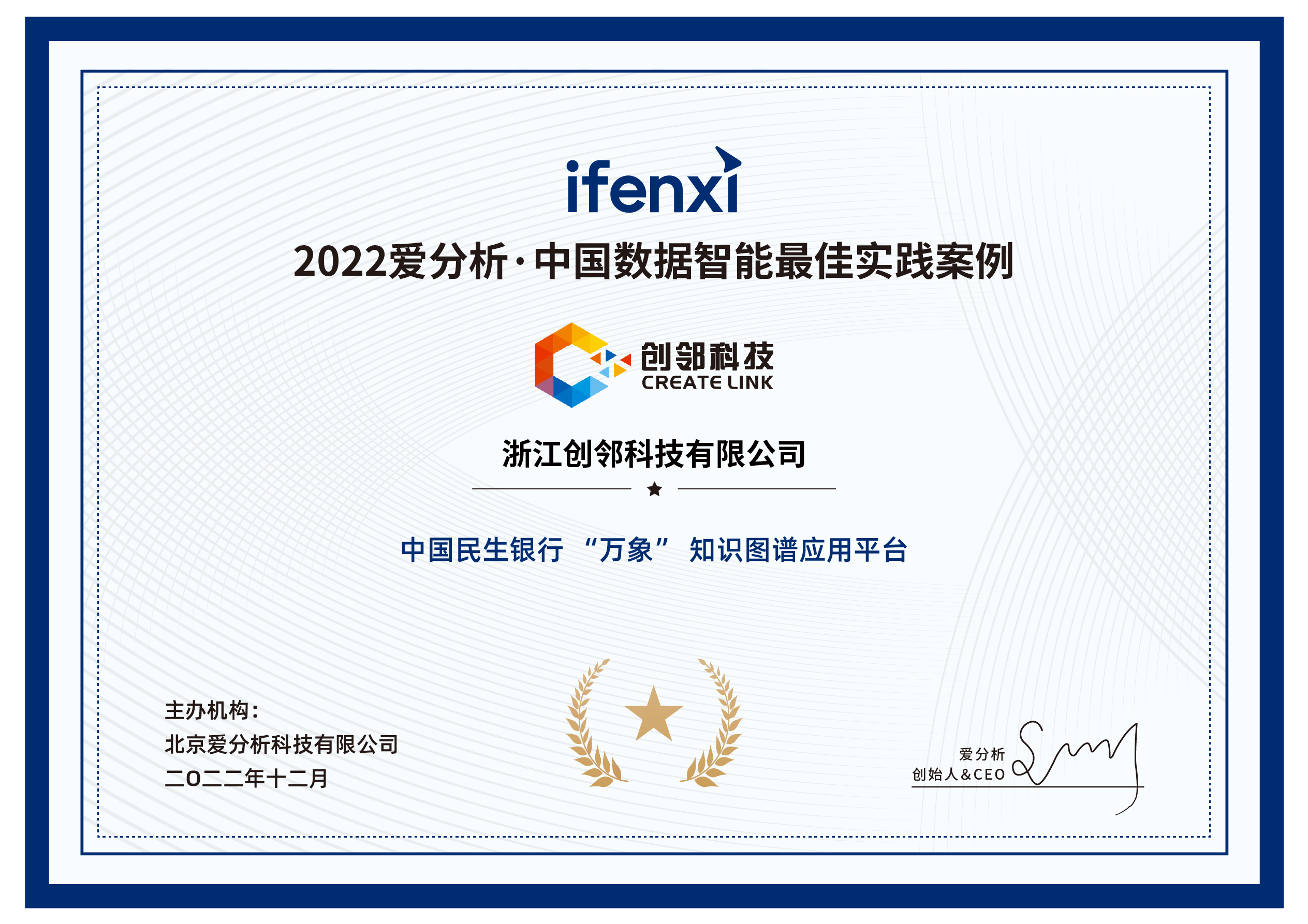 随着2022年进入收官时间,创邻科技喜报频传。近日,“2022爱分析·中国数据智能最佳实践案例”评选结果出炉,经过申报、初评、调研、终评等多轮角逐,创邻科技凭借“中国民生银行万象知识图谱应用平台”成功获评2022中国数据智能最佳实践案例。