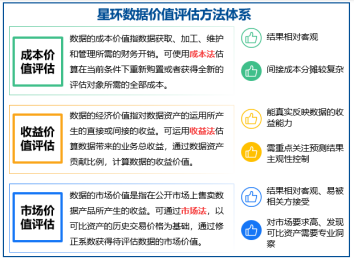 中国资产评估协会在2019年制定的资产评估专家指引第9号中,提出了数据价值评估的成本法、收益法和市场法,这也是当前开展数据估值最常见的3种货币估值方法。为了更好地落地9号指引中的估值方法,星环以9号指引为基础,结合数据特性,并综合考虑了影响数据价值的因素,搭建了星环的数据价值评估方法体系。