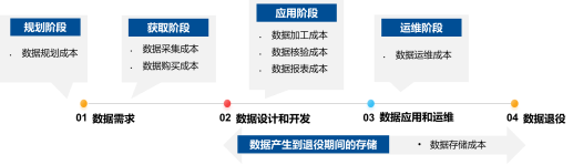 使用成本法计算数据的成本价值,我们从数据的全生命周期出发,分为规划、获取、应用、运维和存储这5个阶段,并将成本细分为8小类。计算公式为:数据成本价值 = 数据规划成本+数据采集成本+数据购买成本+数据加工成本+数据核验成本+数据报表成本+数据运维成本+数据存储成本。
