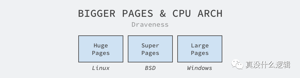 绝大多数的 CPU 架构都支持更大的页面,只是不同操作系统会使用不同的术语,例如:Linux 上的 HugePages、BSD 上的 SuperPages 以及 Windows 上的 LargePages,这些不同的术语都代表着类似的大页面功能。