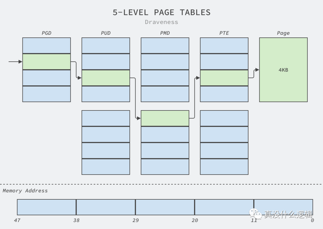 因为进程的地址空间都是虚拟的,所以 CPU 和操作系统需要记录页面和进程之间的对应关系,操作系统中的页面越多,我们也就需要花费更多的时间在如下所示的五层页表结构中查找虚拟内存对应的物理内存,我们会根据虚拟地址依次访问页表中的目录(Directory)最终查找到对应的物理内存: