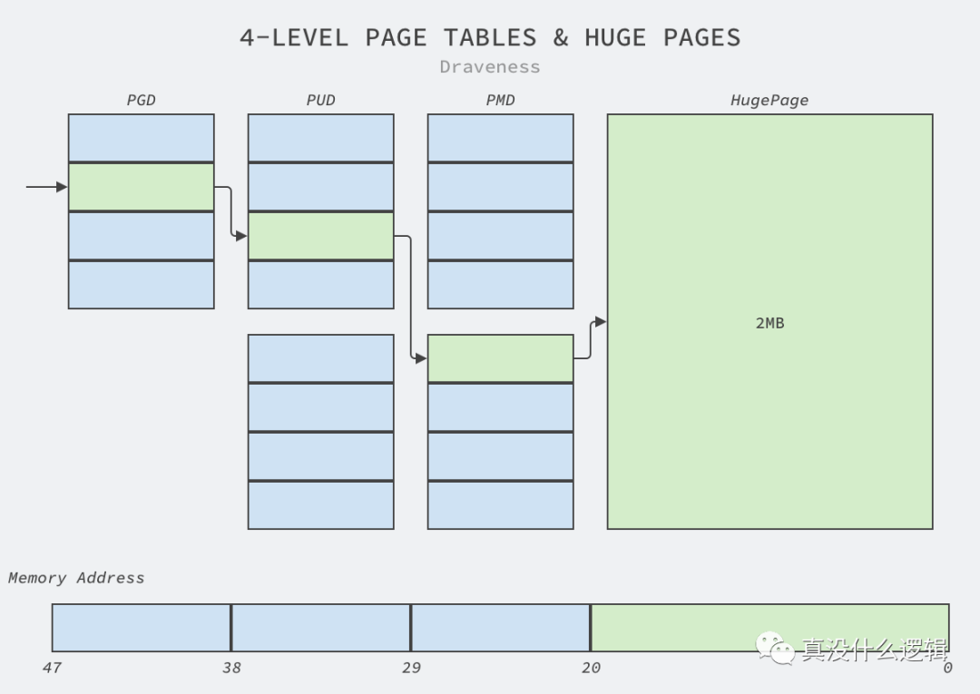 因为 2MB 的内存页占用了 21 位的地址,所以我们也不再需要五层页表中的 PTE 结构,这不仅能够减少翻译虚拟地址时访问页表的次数,还能够降低页表的内存占用。