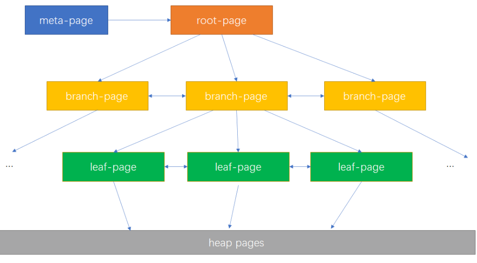 B-tree索引页分为几种:meta-page、root-page、branch-page和leaf-page,如图-1所示。