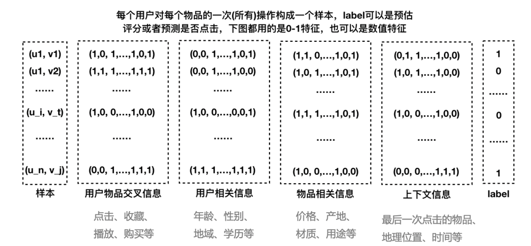 就是各类特征(用户维度特征、物品维度特征、用户行为特征、上下文特征等),而预测值