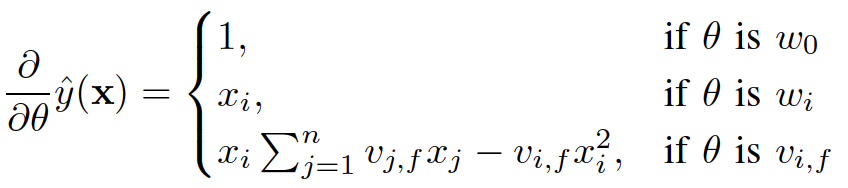 ,所以在迭代更新参数时是非常高效的,见下面的迭代更新参数的公式)。结合公式5和公式6,我们很容易计算出FM模型的梯度如下: