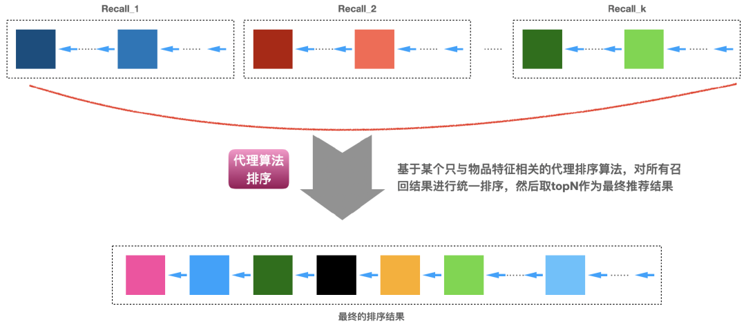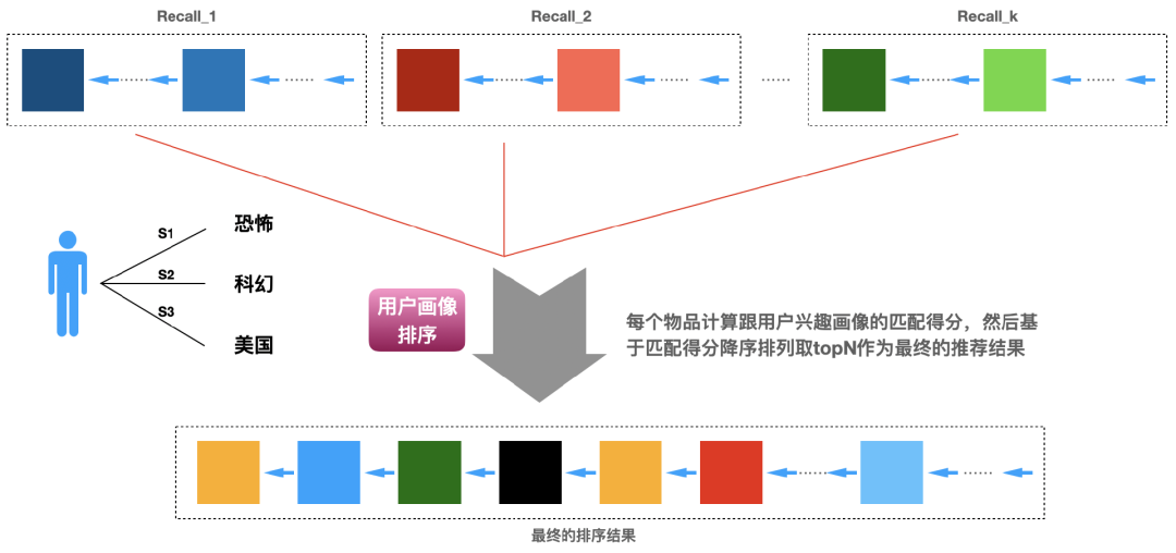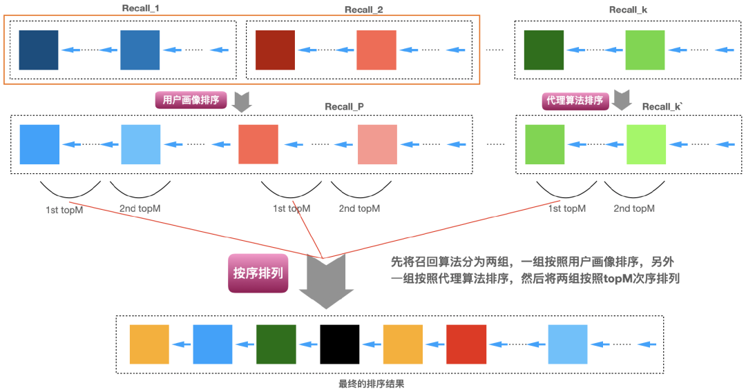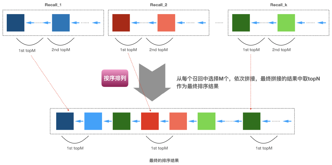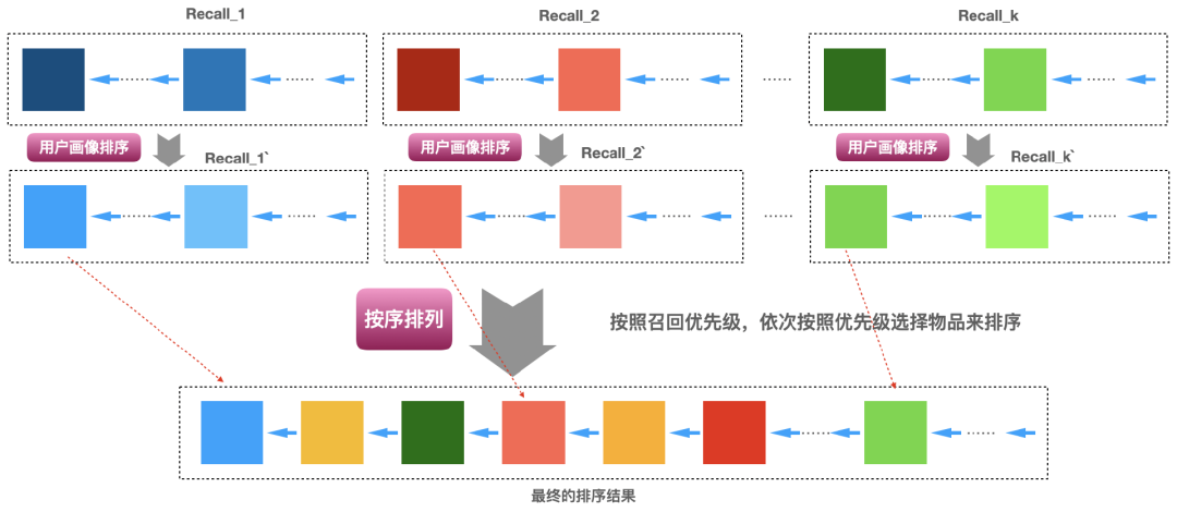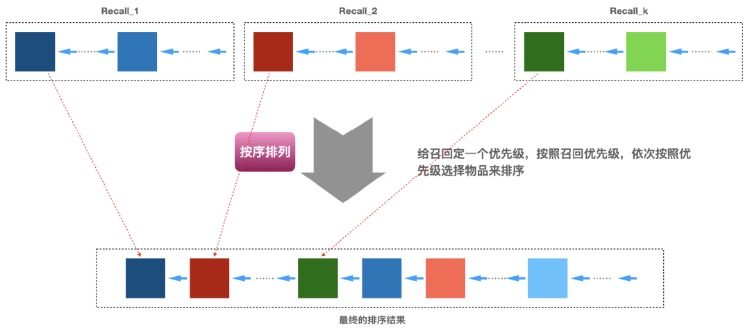 的顺序选择,直到选择的数量凑足N个就完成了,下面图3即说明了这个实现的过程。具体各个召回算法怎么排定优先级,可以有很多方式,比如基于业务的经验,基于运营需要,基于召回算法的效果(比如矩阵分解召回的效果好于item-based召回、item-based召回的效果好于热门召回)等。