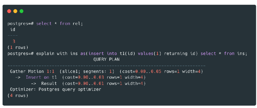 SQL WITH ins AS ( INSERT INTO t1 (t1_id) VALUES(1) RETURNING t1_id ) SELECT * from ins; |