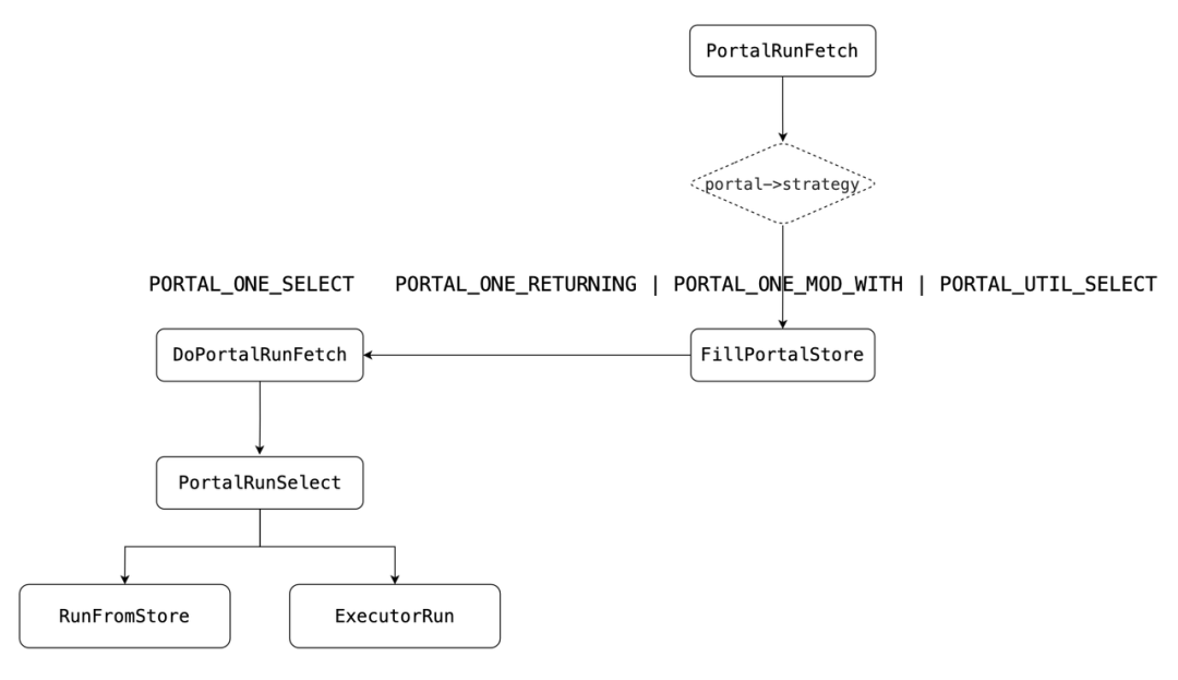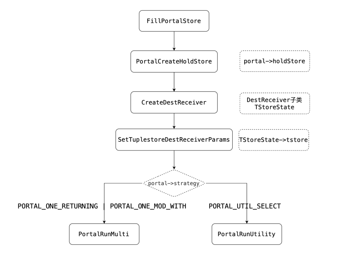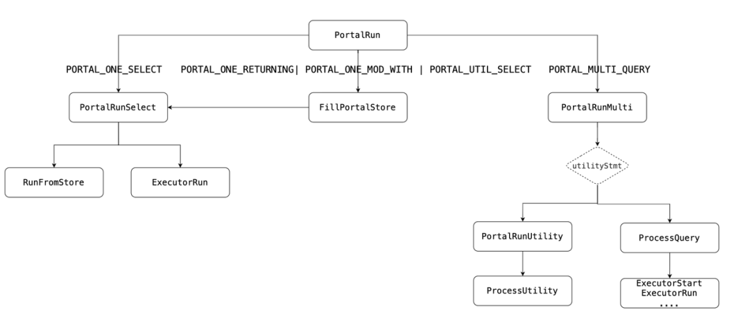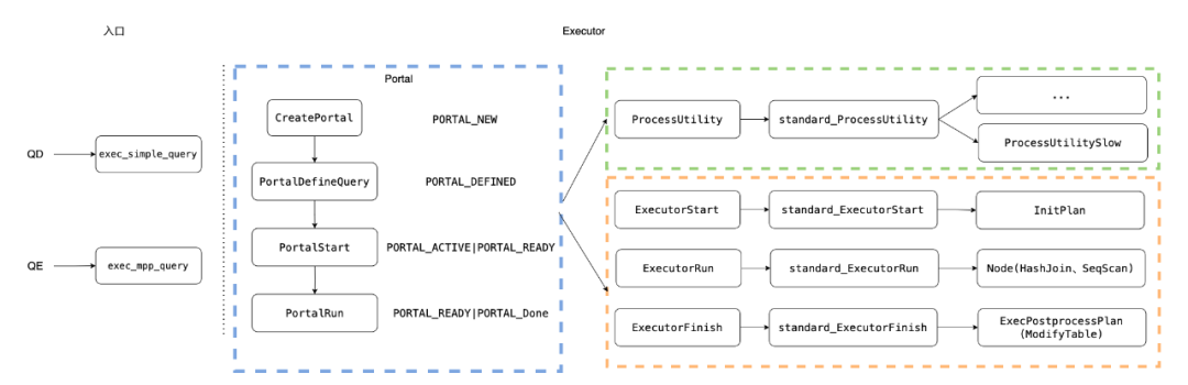 1.在执行Portal过程中发生异常,设置Portal的状态为PORTAL_FAILED;否则,下一步。2.设置Portal状态为PORTAL_READY。根据SQL的语句类型选择不同的执行路径,获取元组数据,完成Portal工作,运行完之后执行完毕,或者进行下一轮(READY,而非ACTIVE)。○set result = Portal->atEnd•PORTAL_ONE_RETURNING|PORTAL_ONE_MOD_WITH|PORTAL_UTIL_SELECT▪可以从holdStore中获取,也可以从ExectorRun中获取○设置是否完成运行标记为Portal->atEnd•调用PortalCreateHoldStore,填充portal->holdStore,然后通过工厂函数CreateDestReceiver构造DestReceiver(子类:TStoreState);PORTAL_UTIL_SELECT调用PortalRunUtility。