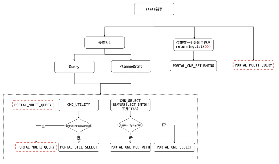 对于像PREPARE st(int) as select * from t1之类utility语句,第一次调用ChoosePortalStrategy,返回PORTAL_MULTI_QUERY(命中PlannedStmt),第二次调用返回PORTAL_ONE_SELECT(命中Query)。