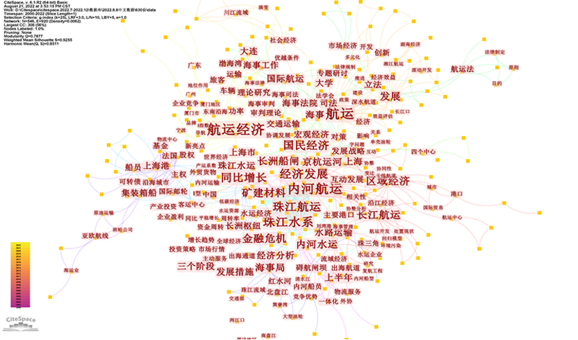 近期,长江航道规划设计研究院利用CiteSpace软件,对“航运经济”研究领域的学术文献进行信息挖掘,构建“航运经济”的知识图谱,进行该领域研究机构、专业人员的合作网络关系分析及其所在领域的交叉关系,梳理“航运经济”研究热点、辨识研究趋势,为研究院开展内河航运经济科学研究和工程应用提供参照。