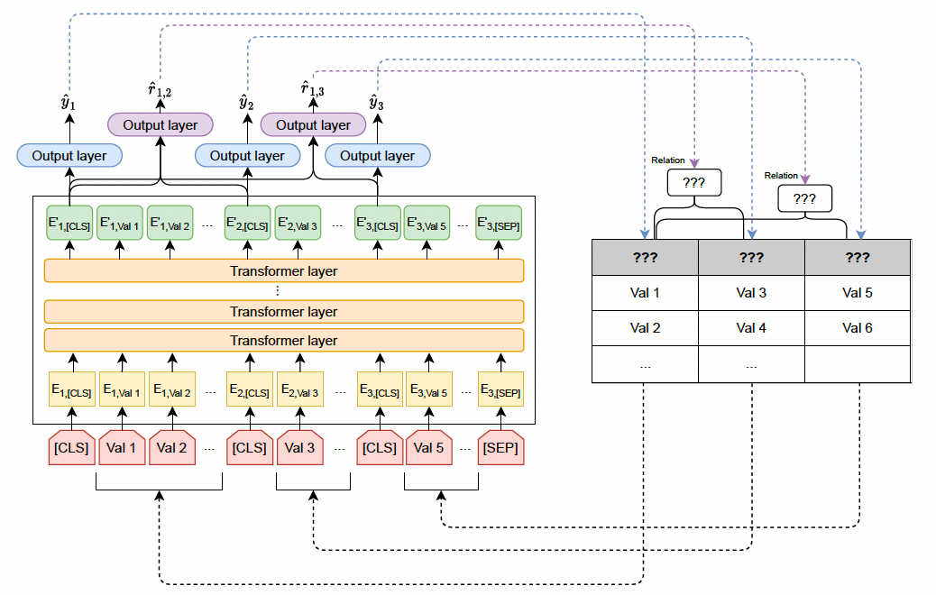这篇工作关注表格列类型预测和列关系识别任务,提出了一个名为DUDUO的多任务学习框架,基于预训练语言模型,DODUO吸收表格上下文信息得到列的向量表示,通过把两个任务统一建模、知识共享,达到相互促进的效果。文章整体结构如下图所示。