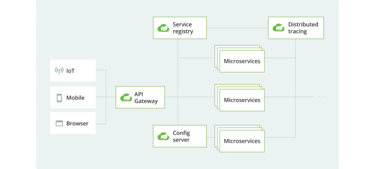Spring Cloud为开发人员提供了工具,以快速构建分布式系统中的某些常见模式(例如:配置管理、服务发现、智能路由、微代理、控制总线、一次性令牌、全局锁、分布式会话、群集状态等)。架构如下: