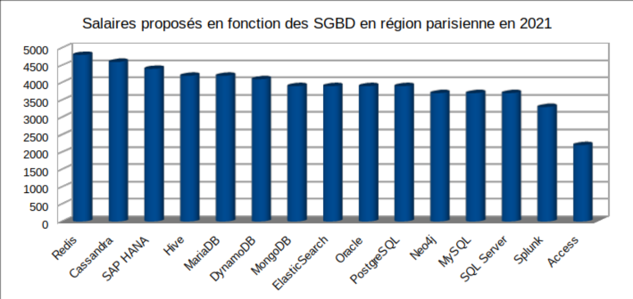 与此同时,Developpez统计了巴黎地区不同数据库对应的平均工资,Redis工资最高,平均为4500欧元,而MySQL和SQL Server薪资较低,约为3000-3500欧元: