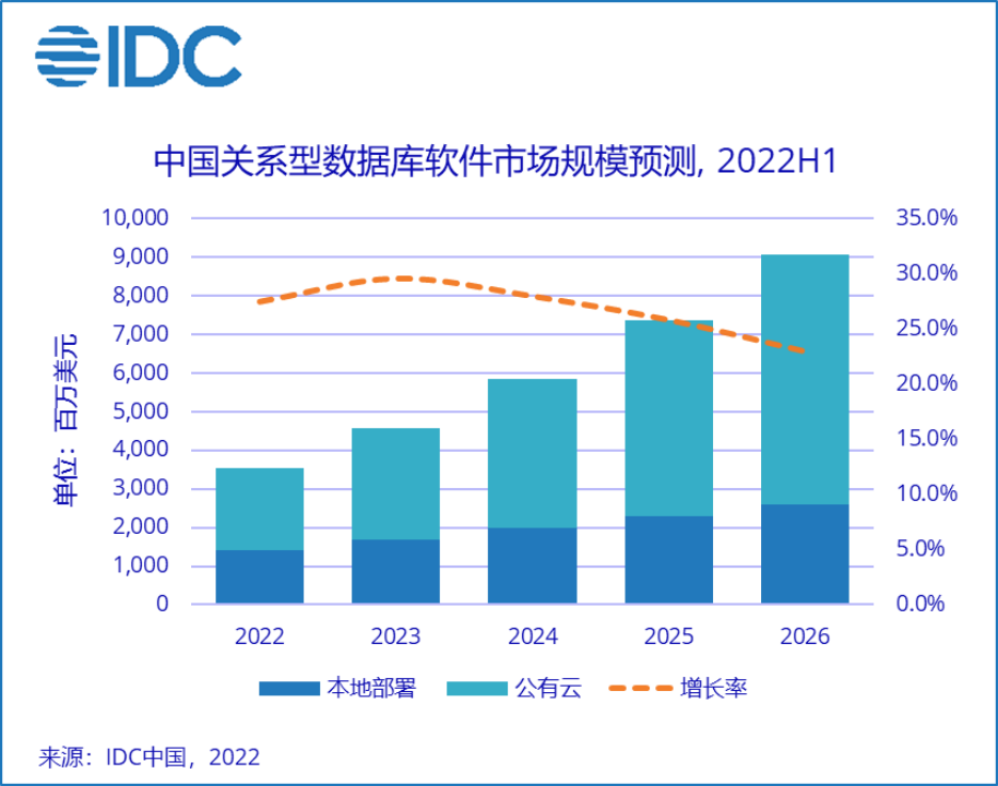 IDC预测, 到2026年,中国关系型数据库软件市场规模将达到90.7亿美元,2021-2026的5年市场年复合增长率(CAGR)为26.8%。