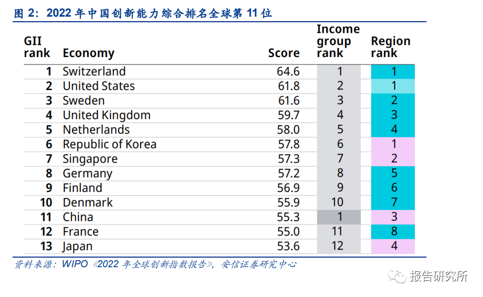 科技自立自强是我国持续创新发展,参与全球竞争的基础和保障。今年 10 月,世界知识产 权组织(WIPO)正式发布《2022 年全球创新指数报告》(以下简称《报告》),2022 年中国 创新能力综合排名全球第 11 位,较上年提升 1 位,较 2012 年跃升 23 位,排名连续十年稳 步提升,位居 36 个中高收入经济体之首。《报告》统计数据显示:中国有 9 项细分指标排 名全球第 1;进入全球百强的科技集群数量达 21 个,比 2017 年增加 14 个,数量首次与美 国持平,居全球首位;全社会研发(R&D)经费中企业资金占比全球排名第 3 位;高技术产 品净出口占贸易总额比重排名第 4 位。从全球创新能力综合排名不难发现,世界范围内的发 达国家无一不是创新强国、科技强国。在单边主义、保护主义上升的大背景下,科技创新成 为国际战略博弈的主要战场,大国之间围绕科技制高点的竞争空前激烈。