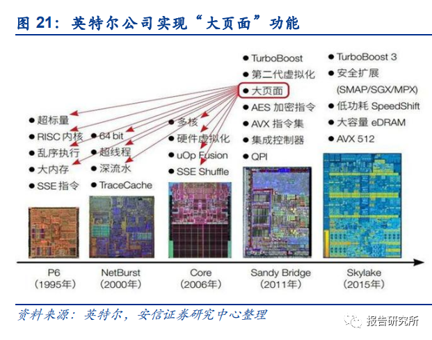 4)梅特卡夫定律揭示了关键核心技术如何形成高价值与高壁垒的内在机理。该定律指出一 个网络的用户数目越多,则整个网络和该网络内的每台计算机的价值呈指数级增长。对于一 项关键核心技术而言,梅特卡夫定律表明其价值将随着集成的功能、模块、算法等点技术的 数量增加而不断提高。但是一旦通过技术攻关成功实现新算法或新功能的集成,构成一个更 大的技术网络,壁垒也就更高。以英特尔公司的桌面与服务器处理器为例,每一代新的处理器架构都会集成多种新功能,这 些新功能的集成都需要大量研发投入。2011 年,Sandy Bridge 架构中集成的新功能“大页 面”技术,需要对十几项已有功能进行修改,这使得处理器的正确性验证面临很大的挑战。而英特尔成功地实现了“大页面”功能的集成,从而在大容量内存的支持方面领先于其他处 理器,获得用户的青睐。