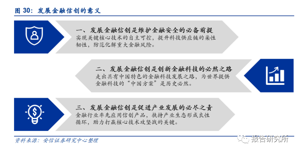 自 2019 年以来,金融行业信创发展进程加快,相关头部机构和证券行业已经开始紧锣密鼓 地启动信创入围测试工作。根据《核心技术崛起:中国金融信创产业发展报告(2021)》,2020 年以来,金融信创试点完成两期,试点范围由大型银行、证券、保险等机构向中小型金融机 构渗透。另外,金融信创生态实验室成立,标志着金融信创正式展开适配验证和生态建设。随着相关试点和案例规模化落地,金融信创在 2021 年迎来元年,金融机构逐年增加金融科 技投入,加快国产基础软硬件、应用系统等转型升级。