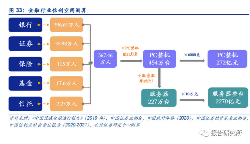 金融业主要可分为银行、证券、保险、基金、信托等。根据各细分行业从业人员数量,假设 PC 整机与从业人员的数量比例为 0.8,我们估算金融业 PC 整机(含软硬件)需求量约 454 万台,市场空间约 272 亿元;假设 PC 对应服务器的配比为 2:1,服务器(含软硬件)的需 求量约 227 万台,市场空间约 2270 亿元。